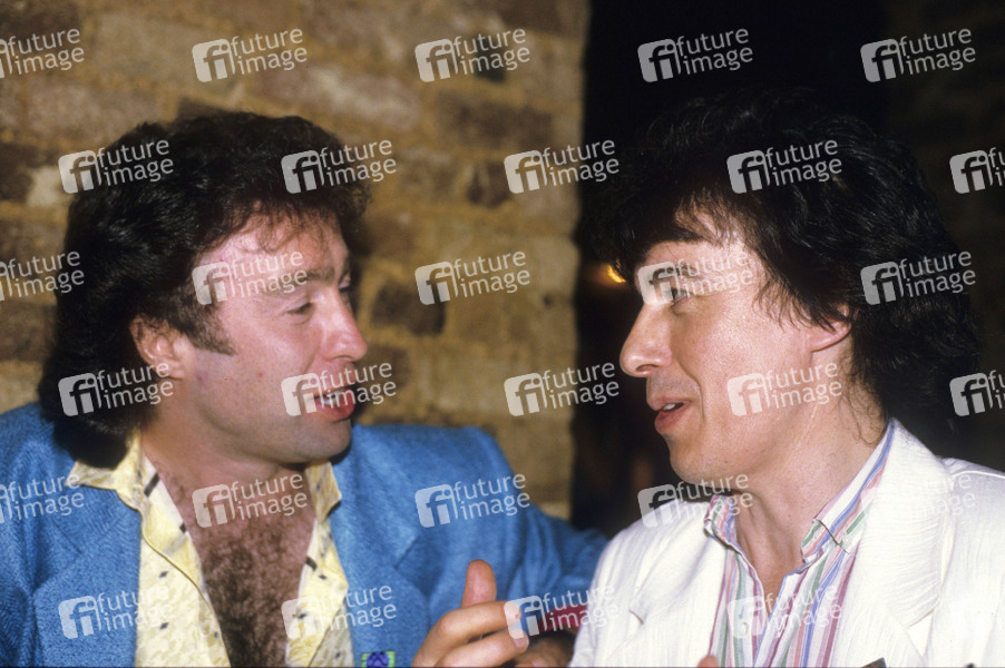 Paul Rodgers und Bill Wyman von Willie and the Poor Boys bei einem Pressetermin. London, 18.04.1985