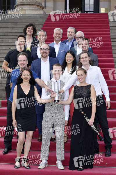 Emmanuel Pahud, Midori Seiler, Andreas Ottensamer, Konstantin Reinfeld, Benedikt Kristjansson, Friederike Roth, Kerstin Schüssler-Bach, Michael Becker, Clemens Trautmann, Guido Evers, Till Janczukowicz, Tobias Feilen und Burkhard Glashoff bei der Pressekonferenz zur Bekanntgabe der Preisträger des Opus Klassik 2019 im Konzerthaus Berlin. Berlin, 02.09.2019