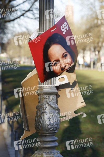 Beeinflussung der Wählerin, Botschaft, Bundestagswahl, Bundestagswahlen, Bundestagswahlkampf, Eigenwerbung, Großflächenplakat, Kampagne, Kandidat, Kandidaten, Kandidierende, Logo, Partei, Partei-Symbol, Parteien, Parteienwerbung, Parteilogo, Plakat, Plakatkampagne, Plakatständer, Politik, Politiker, Politikerinnen, Protestwähler, Slogan, Stammwähler, Wahl, Wahlbeeinflussung, Wahlbeteiligung, Wählen, Wählerschicht, Wählerschichten, Wahlkampagne, Wahlkampf, Wahlkampfmodus, Wahlkandidat, Wahlprogramm, Wahltermin, Wahlwerbung, Wirkung, Wirkungsmacht, Strafen, Eigentum der jeweiligen Partei, Beschädigen, Beschädigung, Geldstrafe, Schadensersatz, Sachbeschädigung, Wahl-Plakate, SPD, Sozialdemokratische Partei Deutschlands, Jessica Rosenthal, Symbolbild, Symbolfoto, Themenbild, Themenfoto