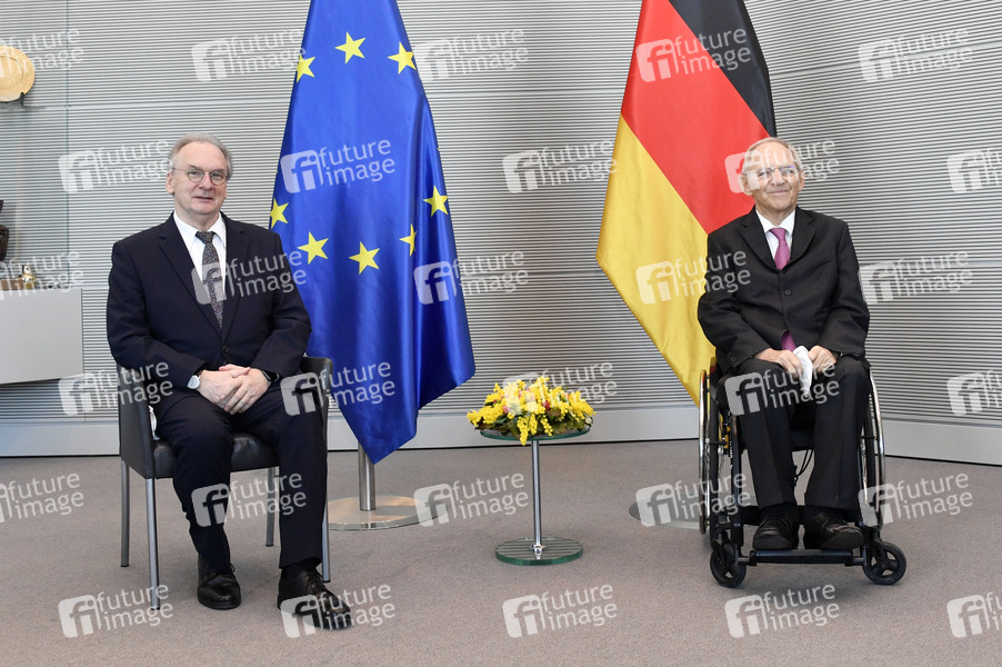Reiner Haseloff und Wolfgang Schäuble beim Fototermin zum Antrittsbesuch von Bundesratspräsident Haseloff bei Bundestagspräsident Schäuble. Berlin, 12.02.2021