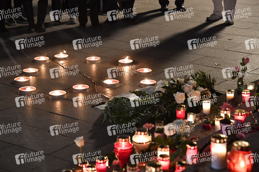 Stilles Gedenken an die Opfer des islamisitischen Terroranschlags vom 19.12.2017 vor niedergelegten Kränzen mit 12-maligem Glockenschlag um 20.02 Uhr am Mahnmal 'Der Riss' auf dem Breitscheidplatz. Berlin, 19.12.2020
