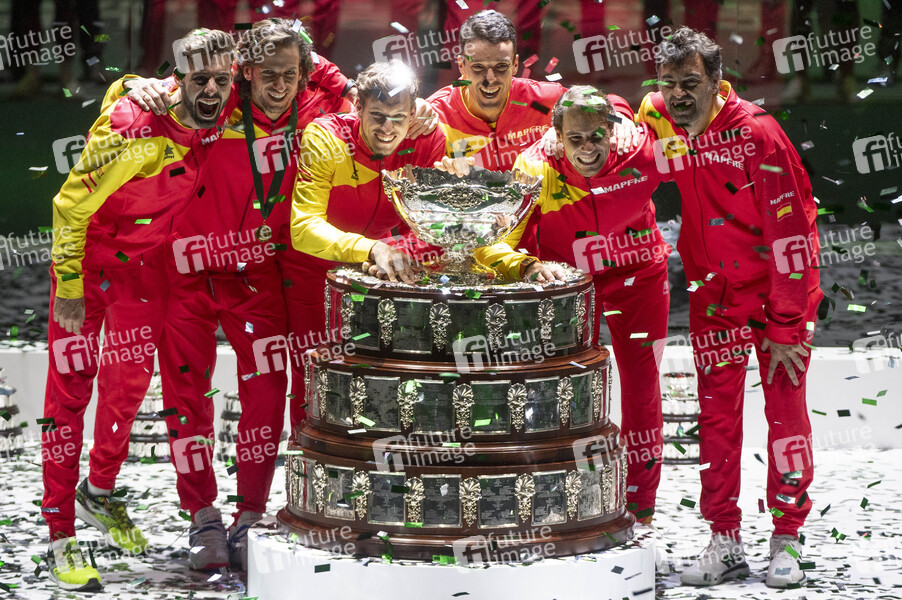 Marcel Granollers, Feliciano Lopez, Pablo Carreno Busta, Roberto Bautista Agut, Rafael Nadal und Sergi Bruguera beim Davis Cup Finale 2019 Spanien gegen Kanada im Sportkomplex Caja Mágica. Madrid, 24.11.2019