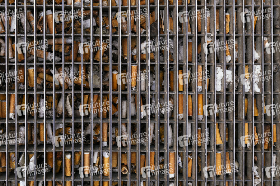 Kippen zwischen den Gitterstäben eines Fußrasters erweisen sich als langfristiger Müll. Die Filter der Zigaretten bauen sich nur langsam ab. (Themenbild, Symbolbild) Köln, 30.12.2021