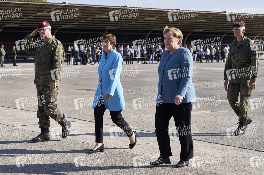 General Eberhard Zorn, Verteidigungsministerin Annegret Kramp-Karrenbauer, Bundeskanzlerin Angela Merkel und Brigadegeneral Jens Arlt bei einem Appell für die Soldatinnen und Soldaten der Evakuierungsmission in Kabul und dem Feierlichen Gelöbnis von Rekruten des Fallschirmjägerregiments 31 in der Fallschirmjägerkaserne Seedorf. Seedorf, 22.09.2021