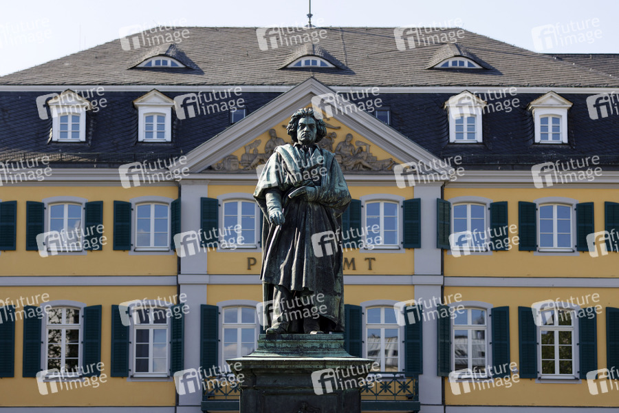 Beethoven-Statue von Ernst Hähnel und Jacob Daniel Burgschmiet auf dem Münsterplatz mit ehemaligem Hauptpostamt. Das Programm zum Beethoven-Jahr wird wegen der Coronakrise bis 2021 verlängert. Bonn, 12.05.2020