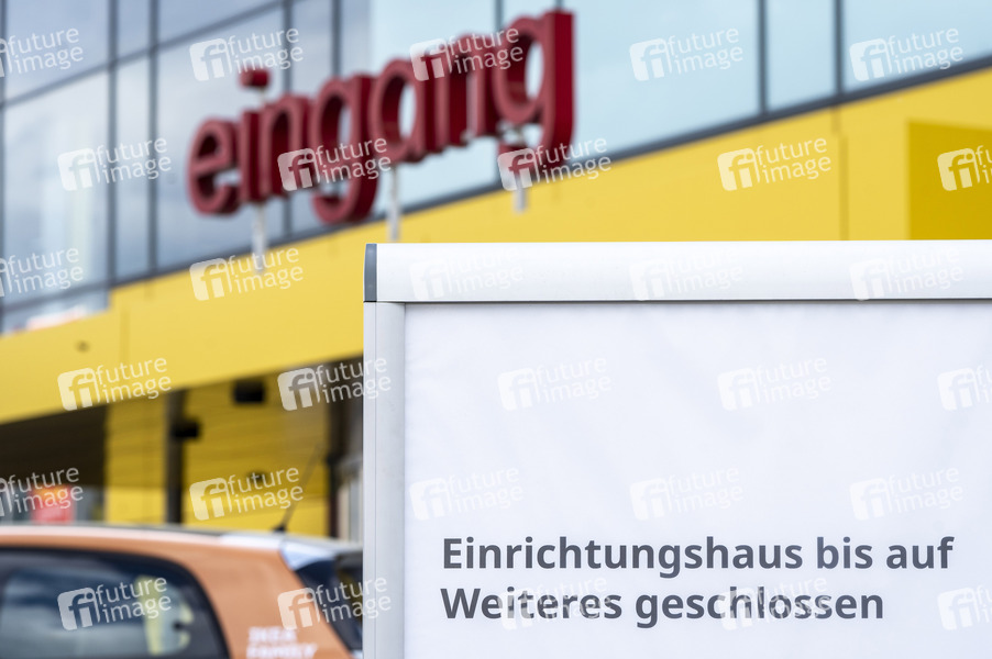 Ikea-Logo, Ikea-Schriftzug, Möbel, Möbelhaus, Inneneinrichtung, Wohnung, Wohnen, Wohnzimmer, Esszimmer, Kinderzimmer, Schlafzimmer, Badezimmer, Wohnkultur, Einrichtungshaus, Großhändler, Discount, Einkaufen, Shopping, Einrichtungskonzern, IKEA-Filiale, IKEA-Katalog, IKEA-Regal, Einrichtungsideen, IKEA-Markt, Möbel-Konzern, Konzern, Konsum, Unternehmen, Firma, Ersteinrichtung, Möbel zusammenbauen, DIY, Do it yourself, Wirtschaft, IKEA GmbH & Co. KG, Coronakrise, Corona-Krise, Kontaktverbot, Abstandsregel, Versammlungsverbot, Seuchenschutz, Quarantäne, Quarantänemaßnahme, Ausgangssperre, Mindestabstand, Social Distancing, Kontakt verboten, Ausgangsbeschränkung, Coronaviren, Virus, Viren, Corona, Covid-19, Coronavirus, Coronaviren, Corona-Virus, Corona-Viren, Ansteckungsgefahr, Epidemie, Pandemie, Infektion, Infektionen, Corona-Angst, Ansteckungsangst, Seuche, anstecken, Krankheit, Vorbeugung, Prävention, schützen, Schutz, Ausnahmezustand, Risiko, Risikobewertungen, Maßnahmen, Coronamaßnahmen, Corona-Infektion, Corona-Infektionen, Corona-Schutz, menschenleer, #stay home, #stayhome, Symbolfoto, Symbolbild