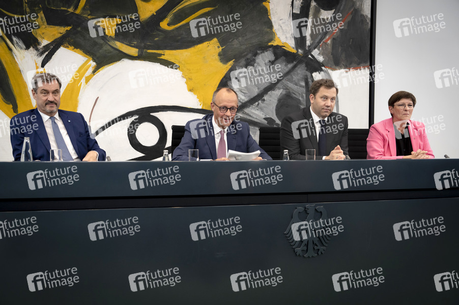 Markus Söder, Friedrich Merz, Lars Klingbeil und Saskia Esken bei der Pressekonferenz nach der ersten Sitzung des Koalitionsausschusses von Union und SPD im Kanzleramt. Berlin, 28.05.2025