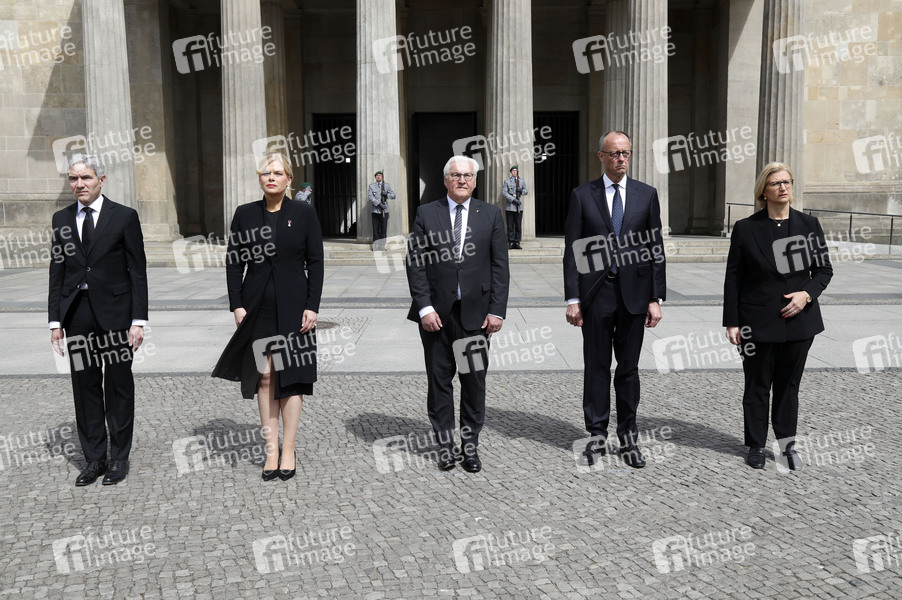 Stephan Harbarth, Julia Klöckner, Frank-Walter Steinmeier, Friedrich Merz und Anke Rehlinger bei der Kranzniederlegung mit den Repräsentantinnen und Repräsentanten der Verfassungsorgane des Bundes zum 80. Jahrestag des Endes des Zweiten Weltkrieges in Europa in der Neuen Wache. Berlin, 08.05.2025