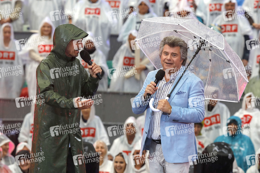 Florian Silbereisen und Andy Borg in der TV-Show 'Schlagerbooom Open Air - Die Stadionshow in Österreich' live aus dem Stadion Kitzbühel. Kitzbühel, 08.06.2024