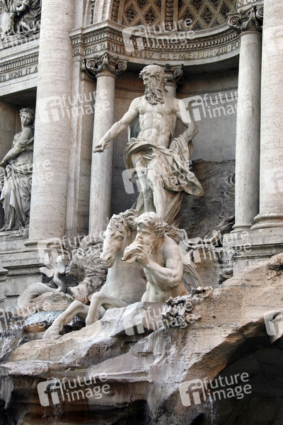 größter Brunnen Roms und einer der bekanntesten Brunnen der Welt, 26 Meter hoch, 50 Meter breit, eingeweiht 1735, besteht aus einer Palastfassade mit Triumphbogen, davor tummeln sich Meeresgestalten auf einer Felslandschaft, Fabelwesen des Meeres, Meerespferde, Tritonen, im Zentrum der herrschaftliche Meeresgott Oceanus