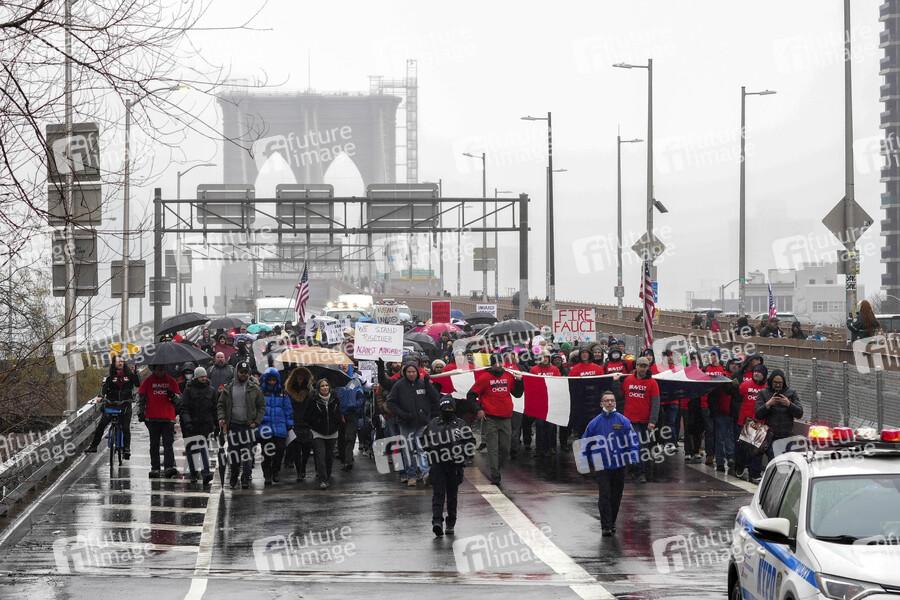 Über 300 Stadtarbeiter und andere protestieren mit einem Marsch über die Brooklyn Bridge, gegen die Ankündigung der Stadt, dass kommunale Angestellte ohne Covid-19-Impfung bis zum Ende der Woche entlassen würden. New York, 07.02.2022