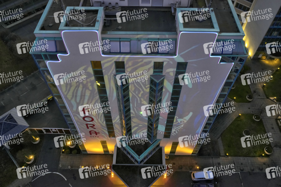3 Tage, 3 Wochen, 3 Künstler - Wir leuchten, um gesehen zu werden' - Graffiti-Kunst von Make Your Mark am Fora Hotel. Gemeinsam mit dem Unternehmen allstars event GmbH, die Aktionen wie 'Hannover leuchtet' und 'Night of Light' umsetzten, wurde dieses Projekt initiiert, um auf drei wichtige Branchen aufmerksam zu machen, die besonders unter den Corona-Maßnahmen leiden, die Hotelbranche, die Veranstaltungsbranche, sowie Kunst und Kultur. (Bildfreigabe des Fora Hotels, der allstars event GmbH und des Künstlers BeNeR1 liegt vor. Der Drohnen-Flug wurde ordnungsgemäß bei der Polizeileitstelle Hannover angemeldet.) Hannover, 01.03.2021