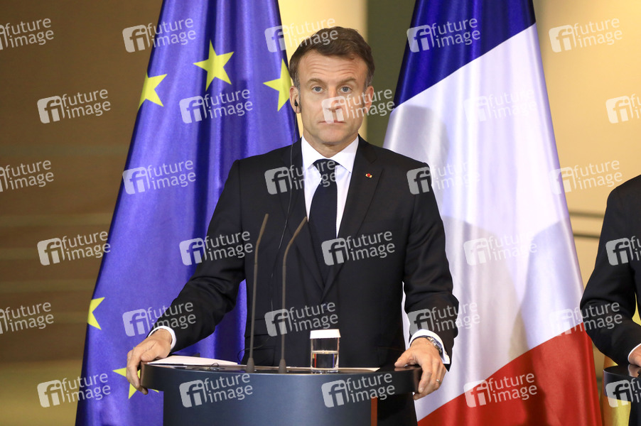 Emmanuel Macron beim Empfang des Staatspräsidenten der Französischen Republik zu einem gemeinsamen Gespräch mit dem Bundeskanzler mit anschließendem Pressestatement im Bundeskanzleramt. Berlin, 18.03.2025
