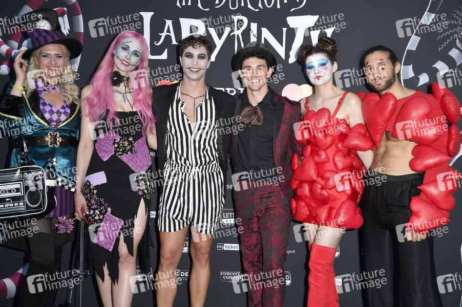 Sarah Knappik, Undine Lux, Julian David, Marc Weinmann, Klaudia Giez und Adriano Salvaggio bei der Premiere der internationalen Ausstellung 'Tim Burton's Labyrinth' in der Radsetzerei auf dem RAW-Gelände. Berlin, 18.07.2024
