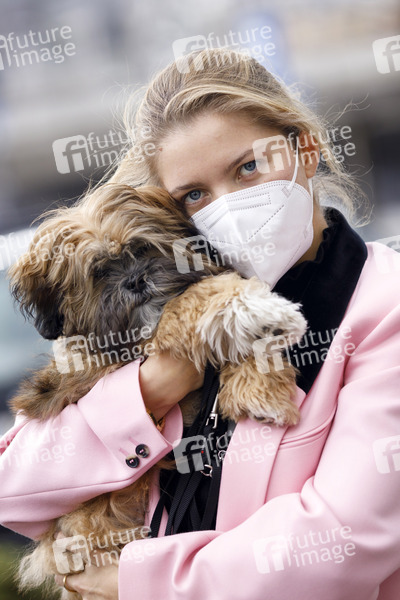 Victoria Swarovski mit ihrem Hund Winnie vor der Abfahrt zu Dreharbeiten zur 13. Staffel der RTL-Tanzshow 'Let's Dance' im MMC Coloneum. Köln, 12.03.2020