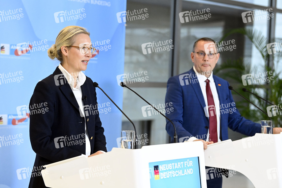 Alice Weidel und Tino Chrupalla beim Pressestatement zur Fraktionssitzung der AfD-Bundestagsfraktion im Reichstagsgebäude. Berlin, 16.12.2024