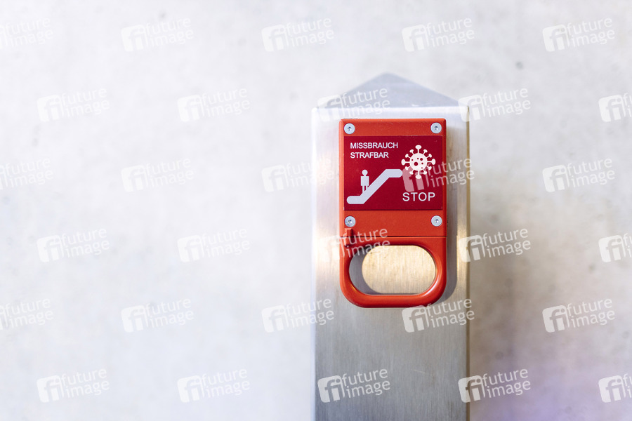Fotomontage: Eine Notbremse mit einem Corona-Symbol. NRW: Das Ministerium für Arbeit, Gesundheit und Soziales hat auf Grundlage der neuen Coronaschutzverordnung die Corona-Notbremse für 31 Kreise und kreisfreie Städte angeordnet. Im Bild eine Notbremse an der Berliner Haltestelle Bundestag. (Fotomontage, Themenbild, Symbolbild) Berlin, 27.03.2021