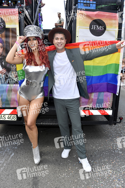 Micaela Schäfer und Maximilian Seitz auf dem JFMS Truck von Julian F. M. Stoeckel bei der 44. Christopher Street Day Parade 2022 unter dem Motto 'United in Love! Gegen Hass, Krieg und Diskriminierung' vom Spittelmarkt auf gut sieben Kilometern über Potsdamer Platz und Potsdamer Straße zum Nollendorfplatz, von dort weiter zur Siegessäule und zum Brandenburger Tor. Berlin, 23.07.2022