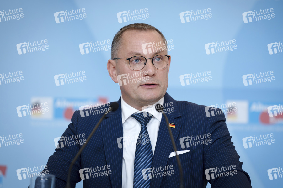 Tino Chrupalla beim Pressestatement zur Fraktionssitzung der AfD-Bundestagsfraktion im Reichstagsgebäude. Berlin, 07.10.2025
