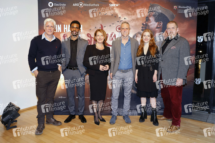 Philipp Brenninkmeyer, Reomy D. Mpeho, Gast, Dror Zahavi, Franziska Brandmeier und Dietmar Bär bei der Preview der Fernsehserie 'Ein Hauch von Amerika' in der Vertretung des Landes Rheinland-Pfalz beim Bund. Berlin, 23.11.2021