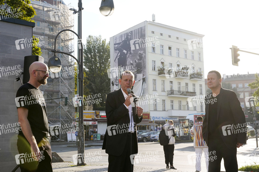 Moritz van Dülmen, Axel Klausmeier und Klaus Lederer bei der Installation eines Großfotos zum 60. Jahrestag des Mauerbaus von Kulturprojekte Berlin und der Stiftung Berliner Mauer am Hermannplatz. Berlin, 13.08.2021