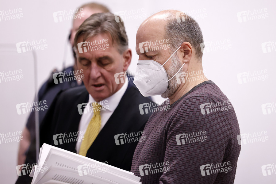 Der Angeklagte Thomas Drach mit seinem Rechtsanwalt Andreas Kerkhof bei seinem Strafprozess vor dem Kölner Landgericht. Der 61-jährige frühere Reemtsma-Entführer soll vier Geldtransporter in Köln, Frankfurt am Main und Limburg überfallen haben. Die Anklage lautet unter anderem auf versuchten Mord und besonders schweren Raub. Der Prozess findet unter aufwendigen Sicherheitsvorkehrungen statt. Köln, 07.02.2022