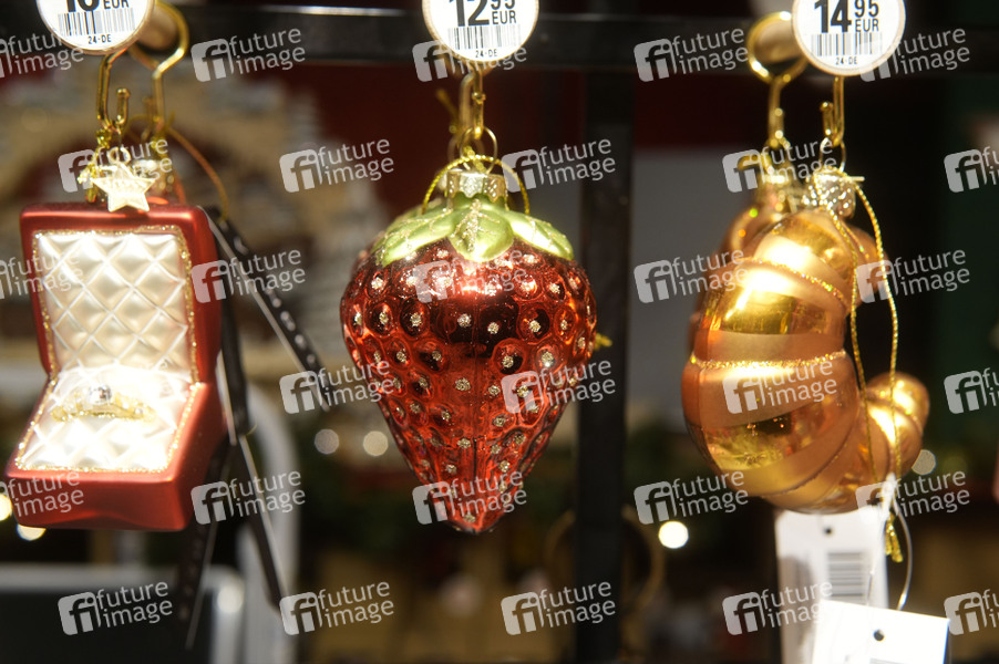 Ringschatulle-, Erdbeere- und Croissant-Weihnachtsbaumanhänger auf dem City-Weihnachtsmarkt an der Gedächtniskirche auf dem Breitscheidplatz. Berlin, 16.12.2024