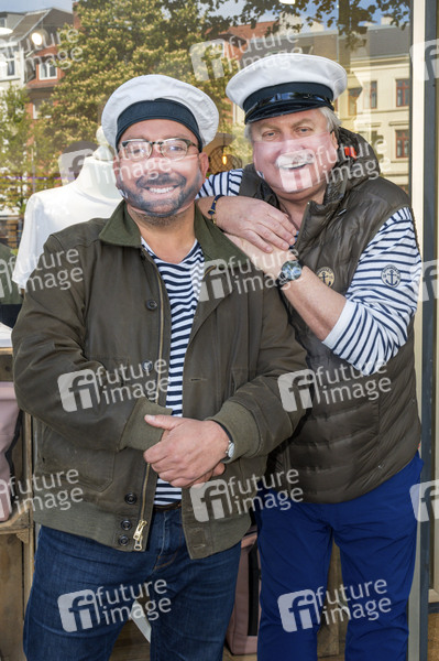 Claas Vogt und Klaus Baumgart von Klaus & Klaus beim Fototermin vor der Textildruckerei EINDRUCK, welche Mund-Nase-Masken mit dem echten Lächeln der Träger herstellt. Hamburg, 06.05.2020