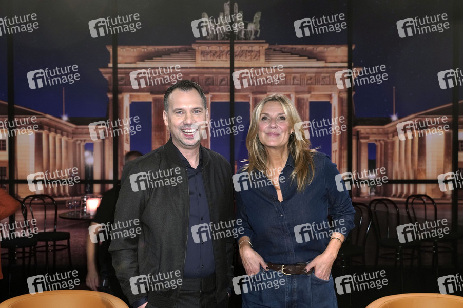 Sebastian Fitzek und Kim Fisher bei der Aufzeichnung der MDR/rbb-Talkshow 'Riverboat' im Studio A im rbb Fernsehzentrum. Berlin, 15.10.2021