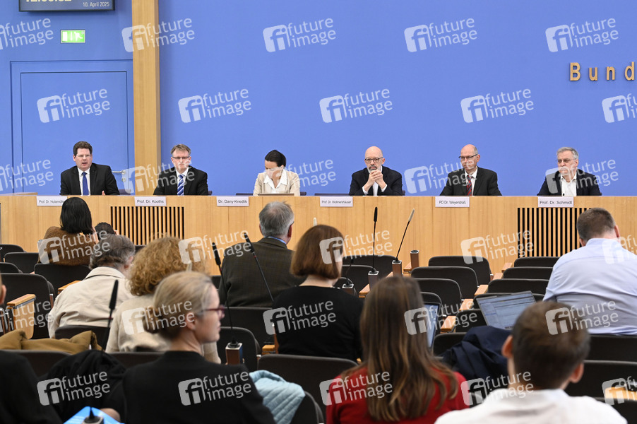 Oliver Holtemöller, Stefan Kooths, Geraldine Dany-Knedlik, Timo Wollmershäuser, Klaus Weyerstraß und Torsten Schmidt bei der Bundespressekonferenz Gemeinschaftsdiagnose der Wirtschaftsforschungsinstitute Frühjahr 2025 im Haus der Bundespressekonferenz. Berlin, 10.04.2025