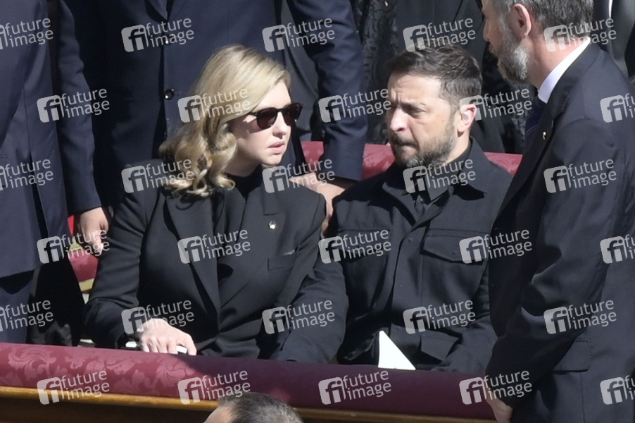 Wolodymyr Selenskyj / Volodymyr Zelenskyy mit Ehefrau Olena Selenska bei der Trauermesse für den verstorbenen Papst Franziskus auf dem Petersplatz. Vatikanstadt, 26.04.2025