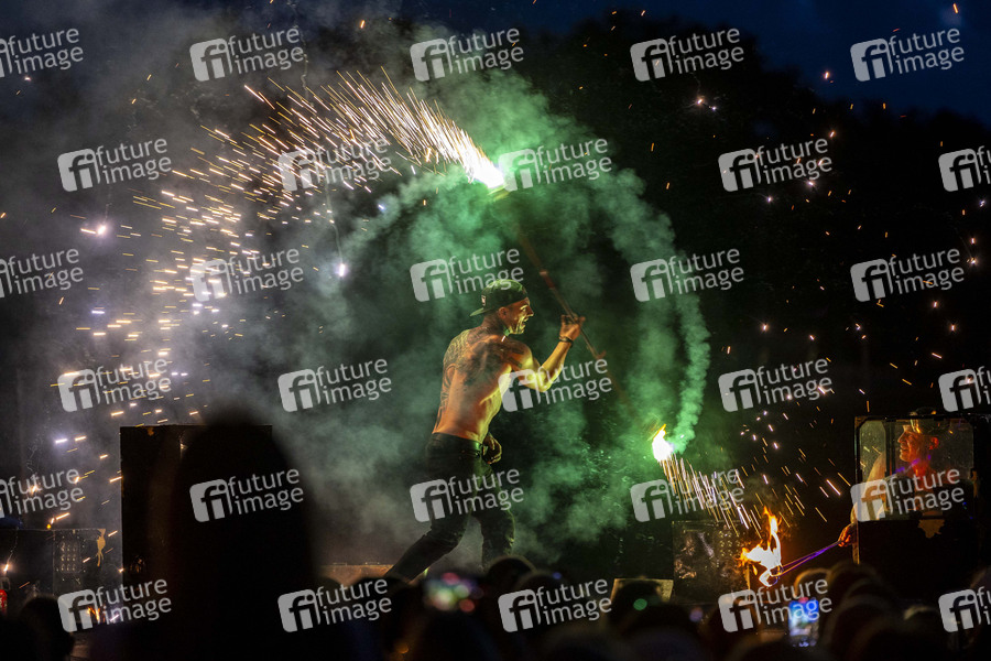 Die Feuershow 360GradEvent bei den Pyro Games 2024 - Feuer, Licht, Laser. Das Duell der Feuerwerker auf dem Messegelände. Erfurt, 17.06.2024