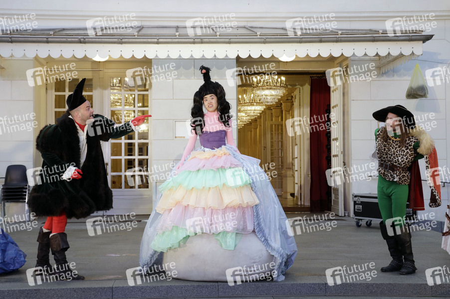 Felix Goeser, Kotbong Yang und Moritz Grove bei der Fotoprobe des Theaterstücks 'Tartuffe oder Das Schwein der Weisen' Open Air auf dem Vorplatz des Deutschen Theaters. Berlin, 17.05.2021