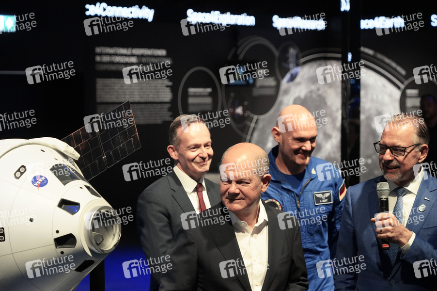 Volker Wissing, Olaf Scholz und Alexander Gerst am Stand der ESA vor einem Modell der Raumkapsel Orion beim Eröffnungsrundgang der ILA Berlin auf dem ILA-Gelände am Flughafen BER Berlin-Brandenburg. Berlin, 05.06.2024