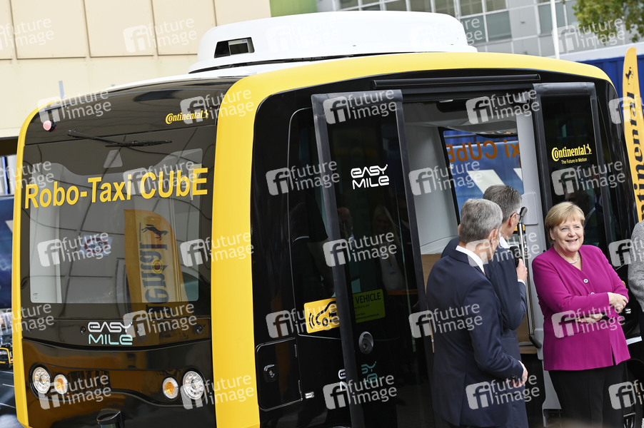 Angela Merkel und Elmar Degenhart am Messestand von Continental im Robo Taxi beim Eröffnungsrundgang auf der Internationalen Automobil-Ausstellung 2019 auf dem Messegelände. Frankfurt am Main, 12.09.2019