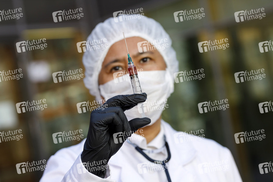 Eine Virologin posiert mit einer Spritze zur Impfung gegen das Corona-Virus. (Symbolfoto mit Model) Nürnberg, 23.04.2020