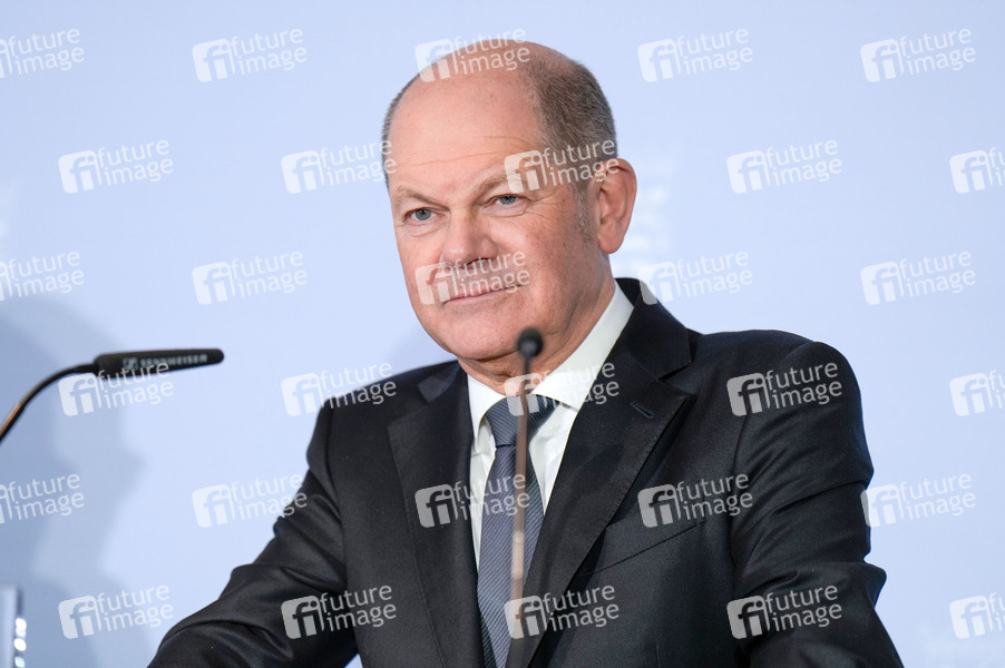 Olaf Scholz bei der Pressekonferenz zur Ministerpräsidentenkonferenz zur Flüchtlingspolitik von Bund und Ländern in der Vertretung des Landes Hessen beim Bund. Berlin, 06.03.2024