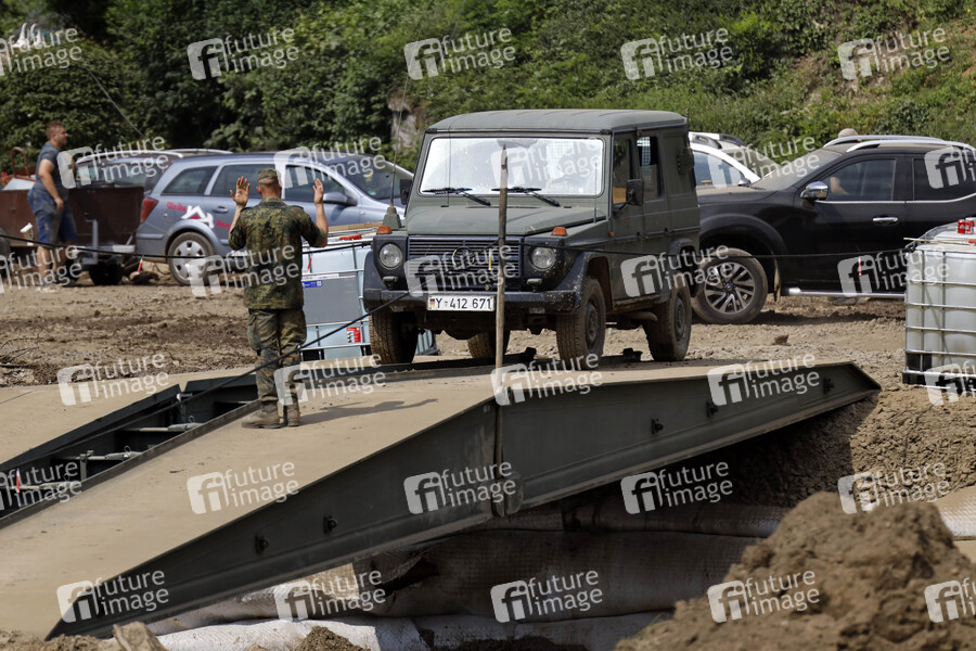 Nach dem Jahrhunderthochwasser in der Eifel durch heftige Regenfälle und Dauerregen mit Überschwemmungen und Überflutungen haben die Aufräumarbeiten im Ahrtal begonnen. Einheiten von Polizei, THW, Bundeswehr und Feuerwehr mitsamt vielen freiwilligen Helfern räumen Straßen, entfernen Schutt und Schlamm und versorgen die Menschen. Im Bild eine von Bundeswehr-Pionieren errichtete Behelfsbrücke in der Ortschaft Rech, in der die Flut viele Häuser zerstörte, 22.07.2021
