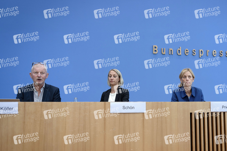 Olaf Köller, Nadine Schön und Karin Prien bei der Bundespressekonferenz 'Vorstellung der Expertenkommission Kinder- und Jugendschutz in der digitalen Welt' im Haus der Bundespressekonferenz. Berlin, 04.09.2025
