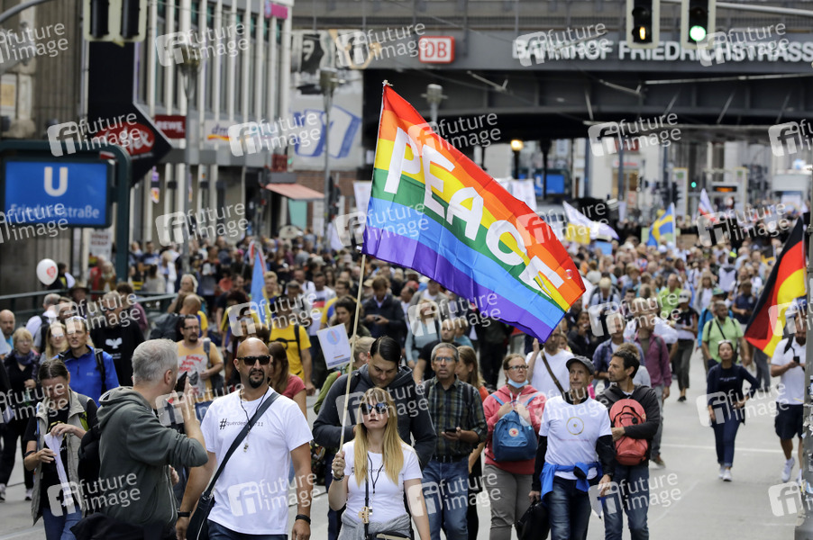 Demonstranten verschiedener Gruppierungen wie etwa der Initiative Querdenken 711 protestierten mit einer Großdemonstration gegen die bestehenden Maßnahmen zur Eindämmung der Corona-Pandemie. Wegen Nichteinhaltung der polizeilichen Auflagen wurde die Demonstration durch die Polizei beendet. Es gab Rangeleien und Festnahmen. Berlin, 29.08.2020