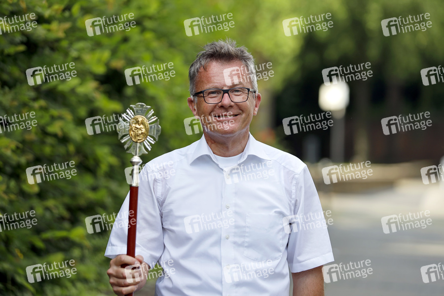Klaus Koltermann bei einer Kundgebung auf dem Börsenplatz, bei der Gläubige aus dem Erzbistum Köln und Aktivisten der Bewegung Maria 2.0 das Verhalten der Kirche und Erzbischof Rainer Maria Kardinal Woelki bei der Aufarbeitung des Missbrauchskandal kritisieren. Am Nachmittag trifft auch eine Pilgergruppe von Pfarrer Klaus Koltermann aus Dormagen Nievenheim mit 60 Christen nach 40 Km Fußmarsch unter dme Motto 'Aufbruch nach Köln' auf dem Börsenplatz ein. Koltermann hat sich als einziger Pfarrer in Deutschland für den Rücktritt von Kardinal Woelki ausgesprochen. Köln, 12.06.2021