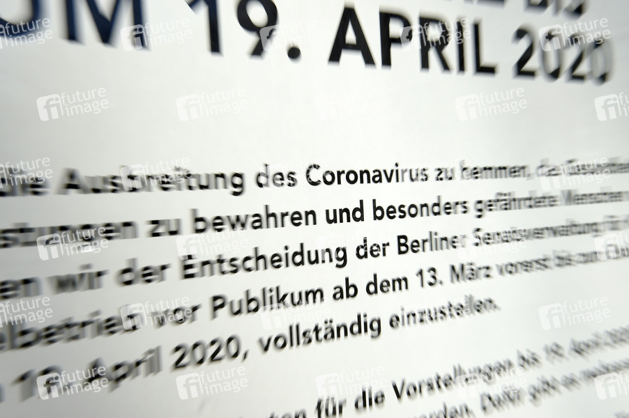 Einstellung des Spielbetriebs im Deutschen Theater. Seit Freitag sind die staatlichen Theater-, Opern- und Konzerthäuser komplett geschlossen, genauso wie die Museen, Gedenkstätten und Bibliotheken. Dem Beispiel der staatlichen Kultureinrichtungen folgen auch die meisten private Bühnen. Ab kommender Woche schließen auch Schulen und Kitas. Berlin, 14.03.2020