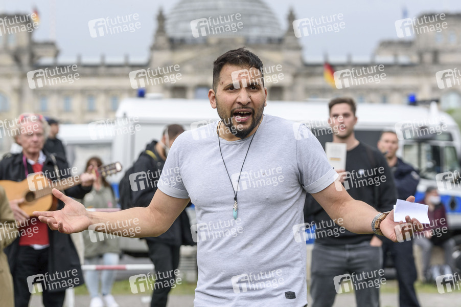 Vegan-Koch Attila Hildmann bei einer unangemeldeten Versammlung gegen die Einschränkung der Grundrechte durch die Corona-Eindämmungsverordnung vor dem Reichtagsgebäude in Berlin. An dem Protest beteiligten sich Verschwörungstheoretiker, Impfgegner aber auch rechte Gruppierungen und Hooligans. Berlin, 23.05.2020
