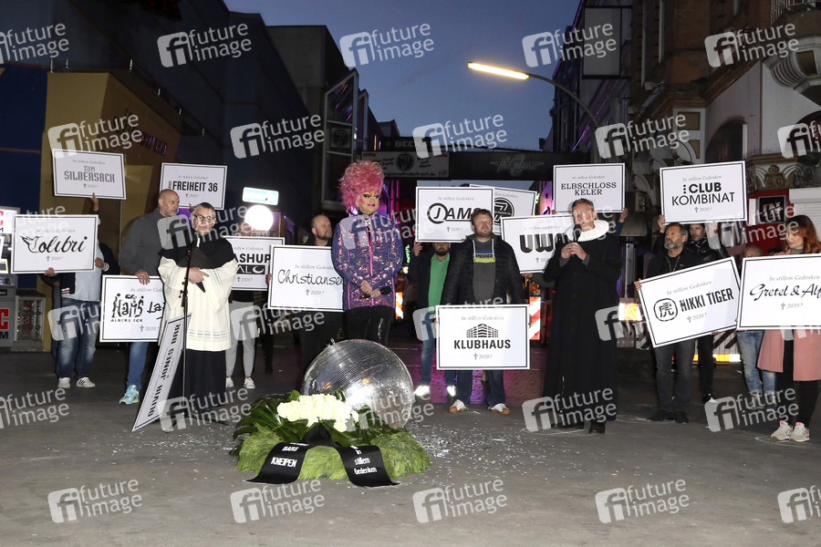 Olivia Jones und Gastronomen bei der Mahnwache und Kranzniederlegung zum Erhalt der Kiez-Kultur in der Großen Freiheit auf der Reeperbahn. Hamburg, 07.05.2020