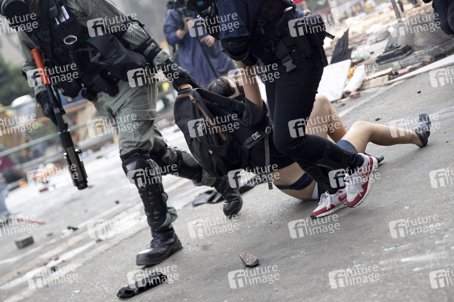 Die Polizei schleppt einen Festgenommenen weg - Belagerung an der Polytechnischen Universität. Die Polizei umstellt den Campus der Universität, nachdem Demonstranten den Cross-Harbor-Tunnel und die Hauptstraße außerhalb des Campus blockiert haben. Hongkong protestiert seit fünf Monaten ununterbrochen. Am Montag, dem 11. November 2019, begann ein Streik in der ganzen Stadt, der Teile von Hongkong zum Erliegen brachte, als MTR-Stationen geschlossen und mehrere Straßensperren errichtet wurden. Hongkong, 18.11.2019