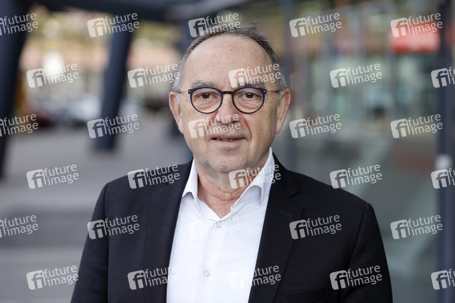 Norbert Walter-Borjans bei der Eröffnung der Ausstellung 'Der Stadt Bestes - Das Gute in der Krise' des Fotografen und Künstler Thomas Ahrendt. Die 70 grossformatigen Bilder sind ab sofort an den Fenstern der Lanxess Arena ebenerdig zu sehen. Köln, 03.05.2021