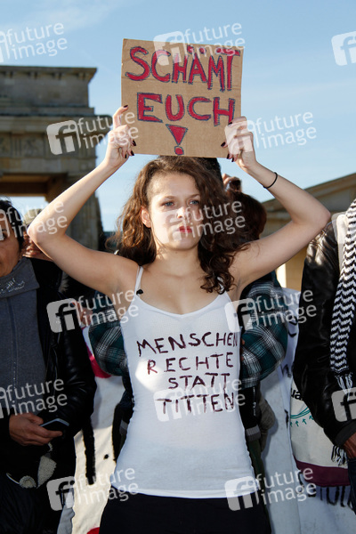 Flüchtlinge und Aktivisten, die vor dem Brandenburger Tor für eine neue Asylpolitik demonstrieren, werden von Politkerinnen der Piratenpartei unterstützt, Berlin