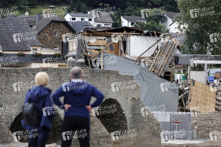 Nach dem Jahrhunderthochwasser in der Eifel durch heftige Regenfälle und Dauerregen mit Überschwemmungen und Überflutungen haben die Aufräumarbeiten im Ahrtal große Fortschritte gemacht. Einheiten von Polizei, THW, Bundeswehr und Feuerwehr mitsamt vielen freiwilligen Helfern haben Straßen geräumt, Schutt und Schlamm entfernt und die Menschen versorgt. Der Wiederaufbau wird trotzdem Jahre dauern. Im Bild Flutschäden in der Ortschaft Rech, in der die Flut viele Häuser zerstörte, 08.08.2021
