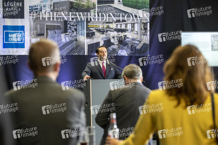 Sven J. Köllmann beim Richtfest des neuen Hotels an der Messe Erfurt. Die Légère Hotelgruppe übernimmt die Leitung. Erfurt, 16.07.2021