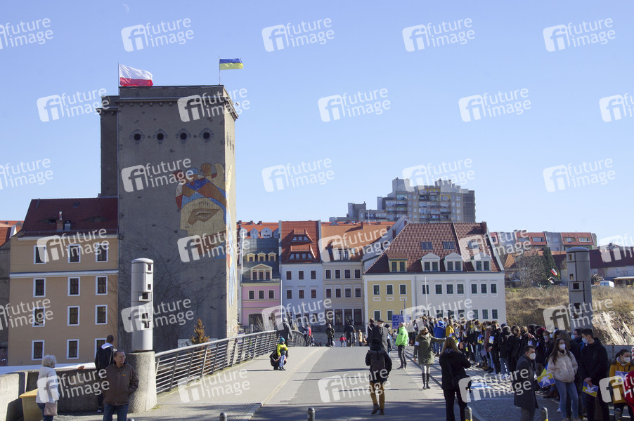 Initiiert vom Görlitzer Augustum-Annen-Gymnasium fanden sich ca. 1.000 Menschen zu einer grenzüberschreitenden Menschen-Kette zusammen, ausgehend von der Altstadtbrücke in beide Richtungen nach Zgorzelec und Görlitz. Mit dabei waren der Görlitzer Oberbürgermeister Octavian Ursu, sein Zgorzelecer Amtskollege Rafal Gronicz und Marcin Król, der Konsul der Republik Polen in Berlin. Görlitz, 09.03.2022